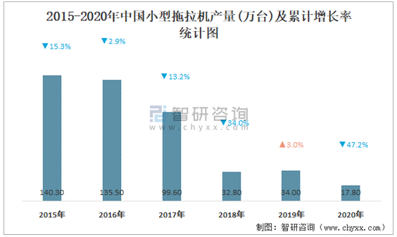 2015-2020年中國小型拖拉機產量及累計增長率統計圖