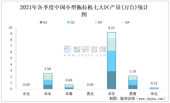 2021年各季度中國小型拖拉機七大區產量統計圖