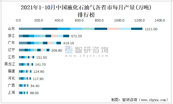2021年1-10月中國液化石油氣各省市每月產量排行榜