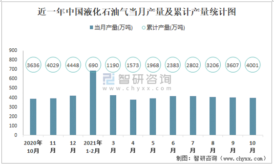 根據國家統計局數據顯示:2021年10月中國液化石油氣產量為396萬噸,同比增長1.3%;2021年1-10月中國液化石油氣累計產量為4000.9萬噸,累計增長9.1%;2015-2020年中國液化石油氣產量逐年遞增,2020年達到最高。