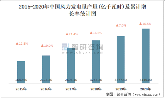 2015-2020年中國風力發電量產量及累計增長率統計圖