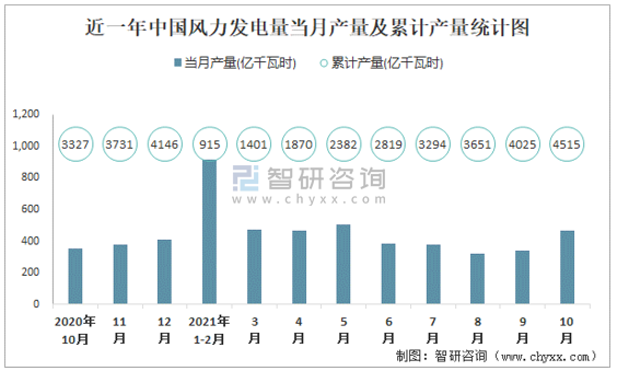 近一年中國風力發電量當月產量及累計產量統計圖