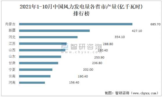 2021年1-10月中國風力發電量各省市產量排行榜