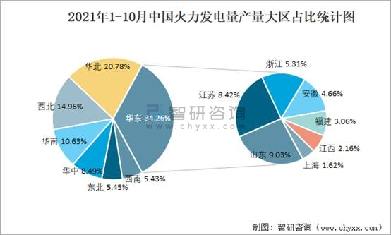 2021年1-10月中國火力發電量產量大區占比統計圖