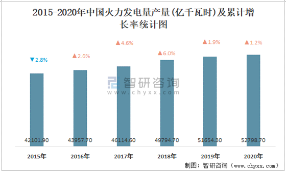 2015-2020年中國火力發電量產量及累計增長率統計圖