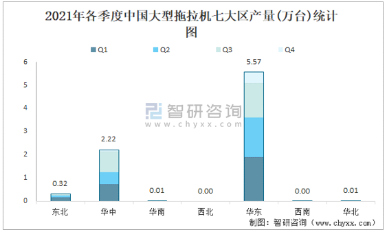 2021年各季度中國大型拖拉機七大區產量統計圖