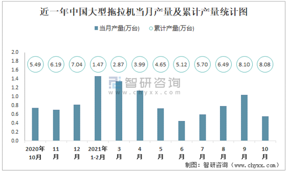 根據國家統計局數據顯示:2021年10月中國大型拖拉機產量為0.6萬臺,同比下降35.8%;2021年1-10月中國大型拖拉機累計產量為8.1萬臺,累計增長26.3%;2015-2020年中國大型拖拉機產量2019年跌至最低,次年有所上升。