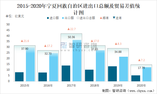 2015-2020年寧夏回族自治區進出口總額及貿易差值統計圖