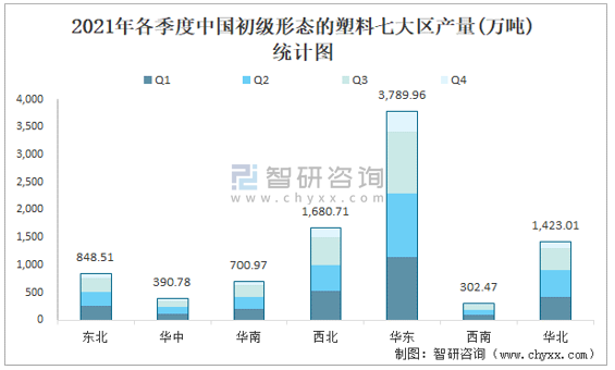 2021年各季度中國初級形態的塑料七大區產量統計圖