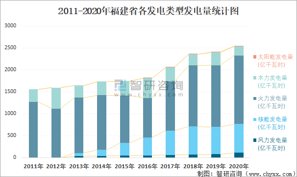 2011-2020年福建省各發電類型發電量統計圖