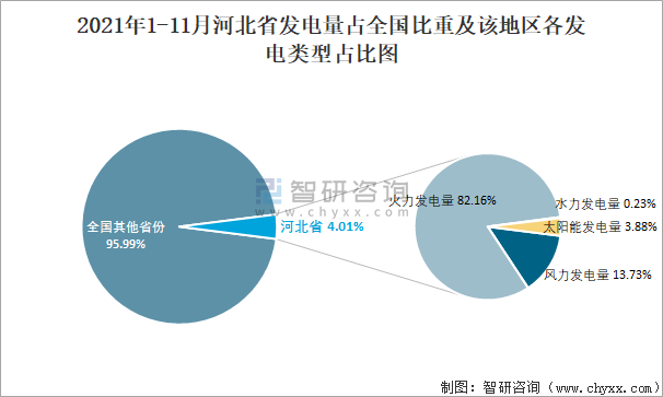 2021年1-11月河北省發(fā)電量占全國比重及該地區(qū)各發(fā)電類型占比圖