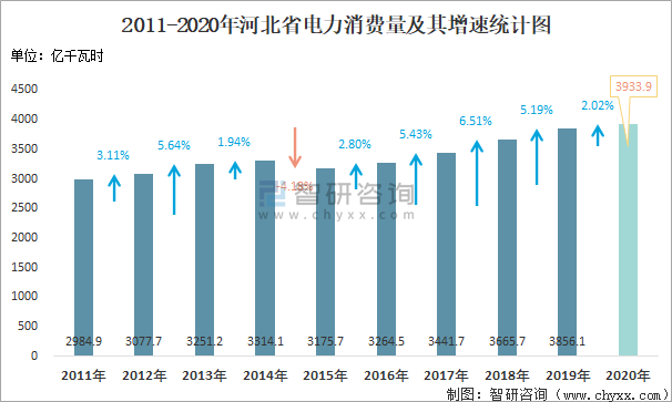 2011-2020年河北省電力消費量及其增速統(tǒng)計圖