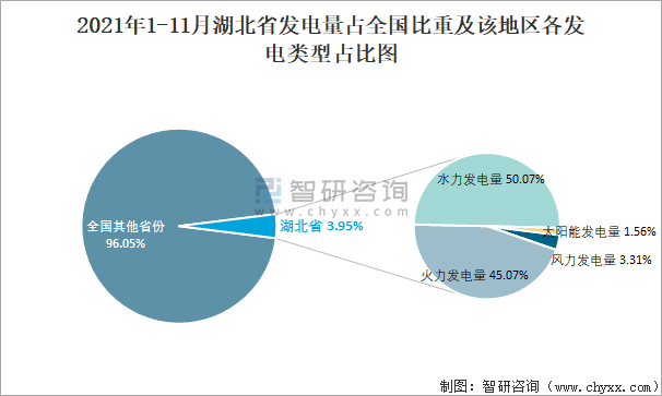2021年1-11月湖北省發(fā)電量占全國比重及該地區(qū)各發(fā)電類型占比圖
