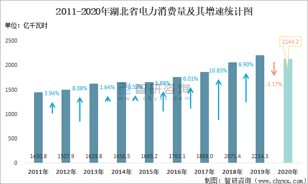 2011-2020年湖北省電力消費量及其增速統(tǒng)計圖
