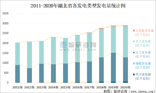 2011-2020年湖北省各發(fā)電類型發(fā)電量統(tǒng)計圖