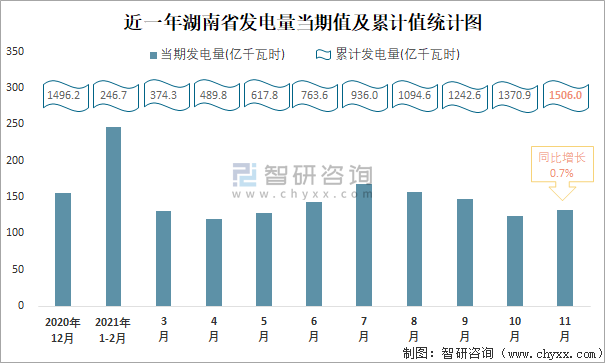 根據國家統計局數據統計可知:2021年11月湖南省發電量為131.6億千瓦時,同比增長0.7%,2021年1-11月湖南省發電量為1506億千瓦時,累計增長11.7%;2021年1-11月湖南省主要有4種類型發電量,發電量占全國比重約為2.04%,其中火力發電量為904.4億千瓦時,占湖南省發電量比重約為60.05%,占全國發電量比重約為1.23%,是湖南省最大發電量類型,目前湖南省暫無核能發電量。