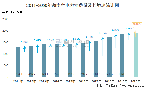 根據國家統計局數據統計可知:2011-2020年湖南省發電量有所波動,總體呈現下降趨勢,從發電量類型來看,火力發電量占比最大(2020年占比為56.89%),且近10年有所波動,總體呈現下降趨勢;2011-2020年湖南省電力消費量(實物量)逐年遞增,2017年-2018年之間增幅最大,為10.35%,2020年湖南省電力消費量(實物量)達到1929.28億千瓦時。