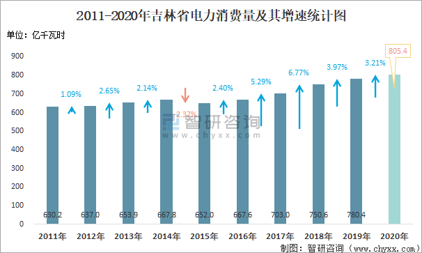 2011-2020年吉林省電力消費量及其增速統(tǒng)計圖