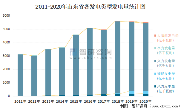 2011-2020年山東省各發電類型發電量統計圖