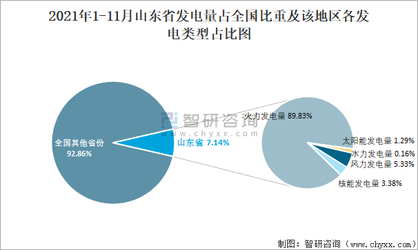 2021年1-11月山東省發電量占全國比重及該地區各發電類型占比圖