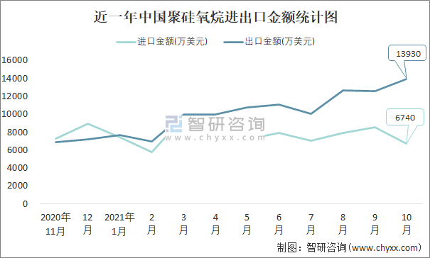 根據中國石油和化學工業聯合會數據顯示:2021年10月中國聚硅氧烷進口數量為0.9萬噸,出口數量為3.1萬噸;進口金額為6740萬美元,出口金額為13930萬美元;近一年中國聚硅氧烷出口總金額大于進口總金額,貿易順差為主,出口均價4494美元/噸。
