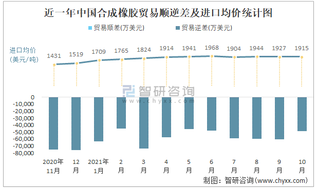 近一年中國合成橡膠順逆差及進(jìn)口均價統(tǒng)計圖