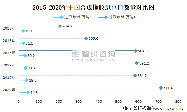 2015-2020年中國合成橡膠進(jìn)出口數(shù)量對比統(tǒng)計圖