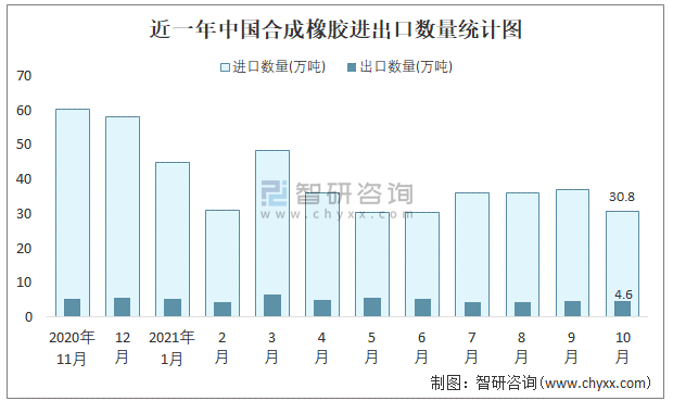 近一年中國合成橡膠進(jìn)出口數(shù)量統(tǒng)計圖