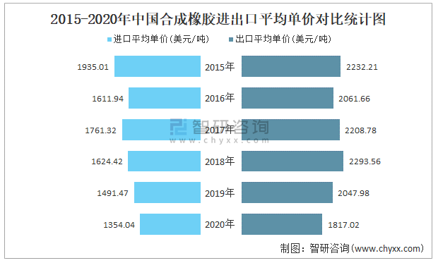 2015-2020年中國合成橡膠進(jìn)出口平均單價對比統(tǒng)計圖