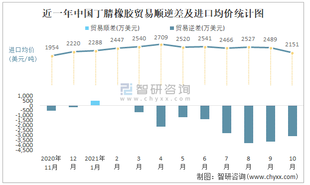近一年中國丁腈橡膠順逆差及進口均價統計圖