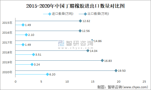 2015-2020年中國丁腈橡膠進出口數量對比統計圖