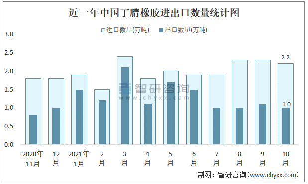 近一年中國丁腈橡膠進出口數量統計圖