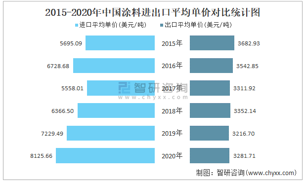 2015-2020年中國涂料進(jìn)出口平均單價(jià)對(duì)比統(tǒng)計(jì)圖