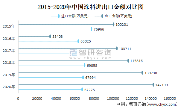2015-2020年中國涂料進(jìn)出口金額對(duì)比統(tǒng)計(jì)圖
