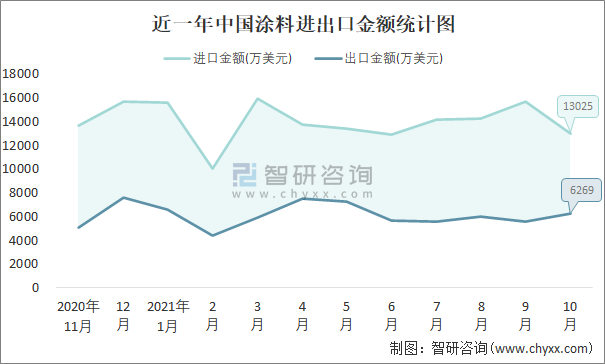 根據(jù)中國石油和化學(xué)工業(yè)聯(lián)合會(huì)數(shù)據(jù)顯示:2021年10月中國涂料進(jìn)口數(shù)量為1.7萬噸,出口數(shù)量為1.8萬噸;進(jìn)口金額為13025萬美元,出口金額為6269萬美元;近一年中國涂料出口總金額小于進(jìn)口總金額,貿(mào)易逆差為主,進(jìn)口均價(jià)7662美元/噸。
