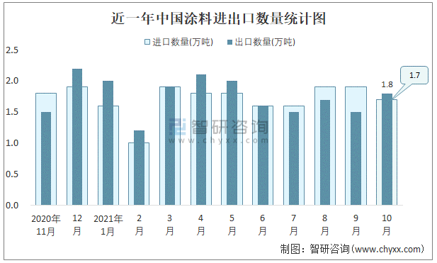 近一年中國涂料進(jìn)出口數(shù)量統(tǒng)計(jì)圖