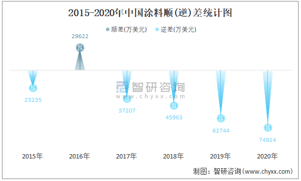 2015-2020年中國涂料順(逆)差統(tǒng)計(jì)圖