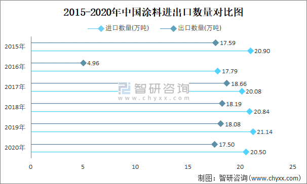 2015-2020年中國涂料進(jìn)出口數(shù)量對(duì)比統(tǒng)計(jì)圖