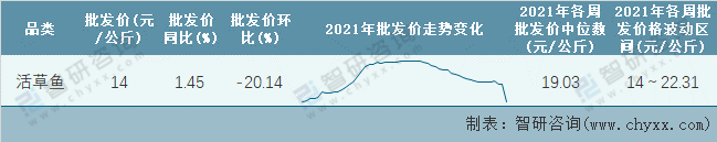 根據農村農業部數據統計可知:2021年第53周全國活草魚平均批發價為14元/公斤,同比增加1.45%,環比下跌20.14%(第52周數據未公布,按第51周的數據統計),2021年活草魚價格總體呈現下降趨勢,價格最高峰出現在年中,2021年全國活草魚平均批發價最高達到22.31元/公斤,批發價最低也要14元/公斤。