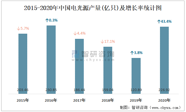 2015-2020年中國電光源產量及增長率統計圖