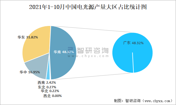 2021年1-10月中國電光源產量為356.5億只 華南地區產量最高(占比48.32%)