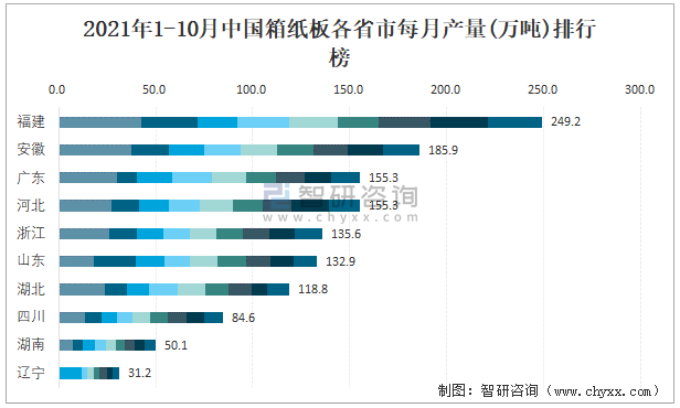 2021年1-10月中國箱紙板各省市每月產量排行榜