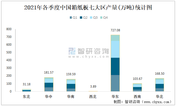 根據國家統計局數據顯示:2021年各季度中國箱紙板主要集中在華東、華中、華北地區生產;2021年1-10月中國箱紙板產量大區分布不均衡,其中華東地區產量最高,特別是福建省貢獻了最多產量;2021年1-10月中國箱紙板各省產量呈現梯隊式分布,福建、安徽、廣東等省產量最多。