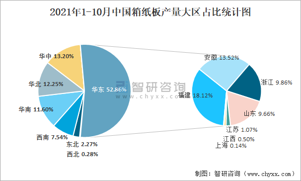 2021年1-10月中國箱紙板產量大區占比統計圖