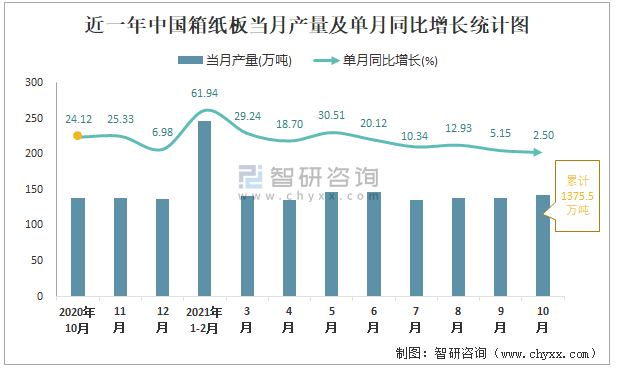 根據國家統計局數據顯示:2021年10月中國箱紙板產量為143萬噸,同比增長2.5%;2021年1-10月中國箱紙板累計產量為1375.5萬噸,同比增長23.17%;2015-2020年中國箱紙板產量總體呈現上升趨勢,2020年達到最大。