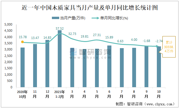 根據(jù)國家統(tǒng)計(jì)局?jǐn)?shù)據(jù)顯示:2021年10月中國木質(zhì)家具產(chǎn)量為3256萬件,同比下降2.74%;2021年1-10月中國木質(zhì)家具累計(jì)產(chǎn)量為30338.4萬件,同比增長18.32%;2015-2020年中國木質(zhì)家具產(chǎn)量2018年跌至最低值,此后呈現(xiàn)遞增趨勢。