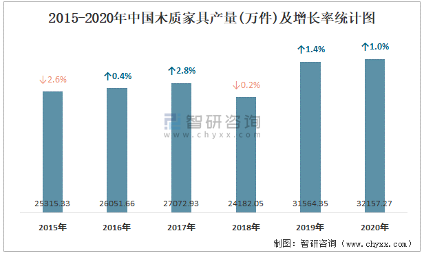 2015-2020年中國木質(zhì)家具產(chǎn)量及增長率統(tǒng)計(jì)圖