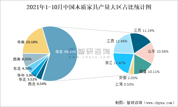 2021年1-10月中國木質(zhì)家具產(chǎn)量大區(qū)占比統(tǒng)計(jì)圖