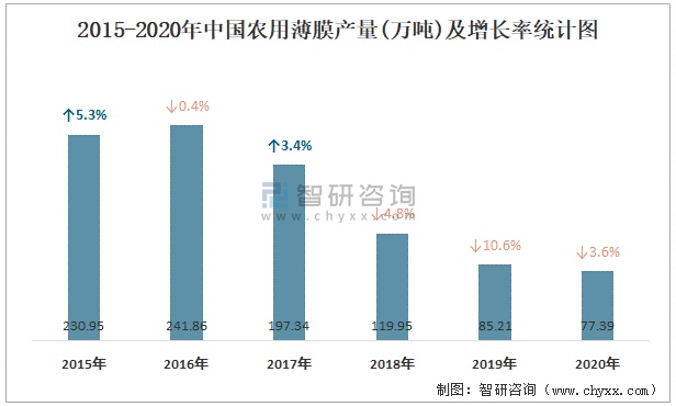 2015-2020年中國農用薄膜產量及增長率統計圖