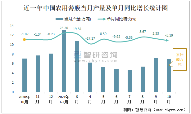 根據國家統計局數據顯示:2021年10月中國農用薄膜產量為7萬噸,同比下降5.19%;2021年1-10月中國農用薄膜累計產量為63萬噸,同比增長0.31%;2015-2020年中國農用薄膜產量2016年達到最高,此后逐年遞減。